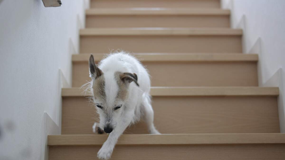 A dog slides down a flight of stairs and gets a nice belly rub during the trip down.
