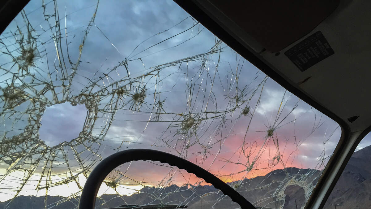 A tow truck's dash cam records the moment a huge block of ice crashes into its windshield since the car passing by was not completely cleared off.