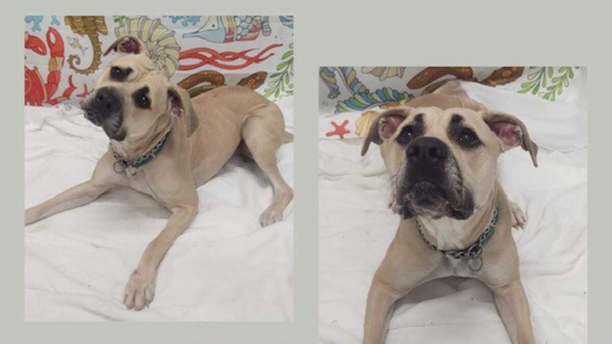 Meet Alley! And though she’s not a small dog, she’s certainly not a large dog for her mix-breed. Showing the characteristics of a Mastiff, Alley is blond in color and has a black muzzle. This sweet girl weighs in at 62 pounds and is considered to be medium in size.